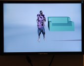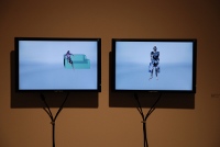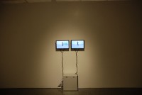 Becoming is a two-channel computer-driven video installation, in which two computer animated figures live in a minimally-furnished virtual domestic space. They stand and watch the viewer, yawn, sit on the sofa, talk on their cell phones, each on their own LCD screen. Alongside this simulation, another process continually manipulates their geometric mesh data, exchanging the vertex and polygon data between the two figures. Over time this causes each figure to take on attributes of the other, though distorted by the structure of their digital information. The process has none of the smoothness of a "morphing" effect, instead rupturing the surface of the figures and turning them into fragmented hybrids - two figures each becoming something new from the other's presence. Becoming is a durational piece - the process is slow and continuous, lasting weeks or months.